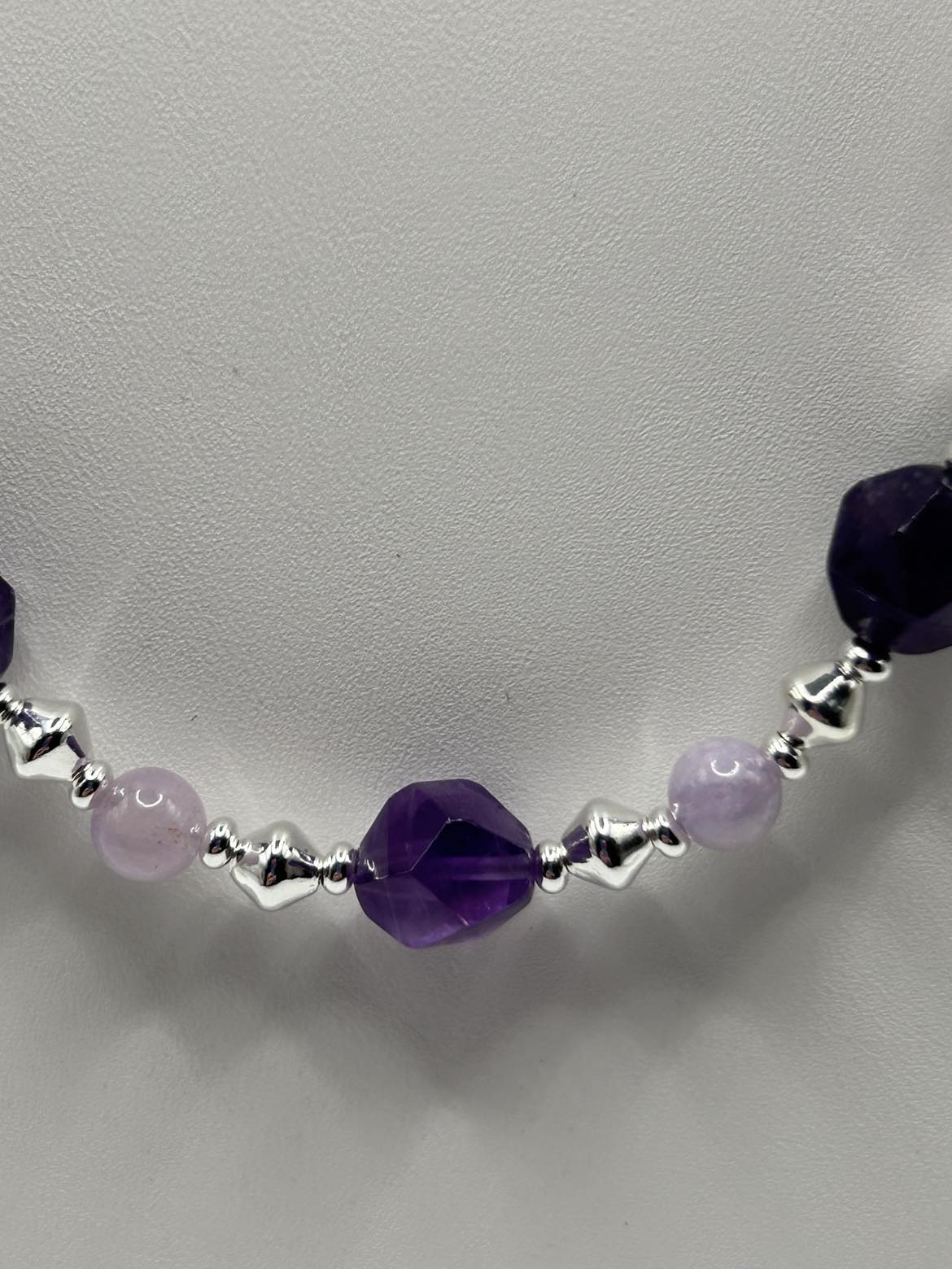 Deep, rich purple Amethyst is paired with pale Lavender Amethyst for a winning look! Sterling silver lever backs support hoop style earrings. The necklace is 21 - 23 inches in length, with an oversize lobster claw clasp for ease of use.