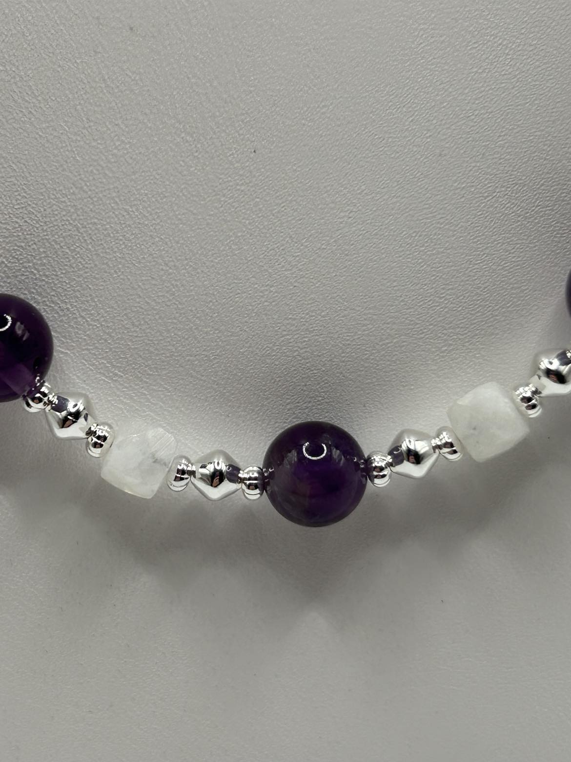A classic look - purple Amethyst paired with white Moonstone!! Sterling silver ear wires support hoop style earrings. The necklace is 22 - 24 inches long, with an oversize lobster claw clasp for ease of use.