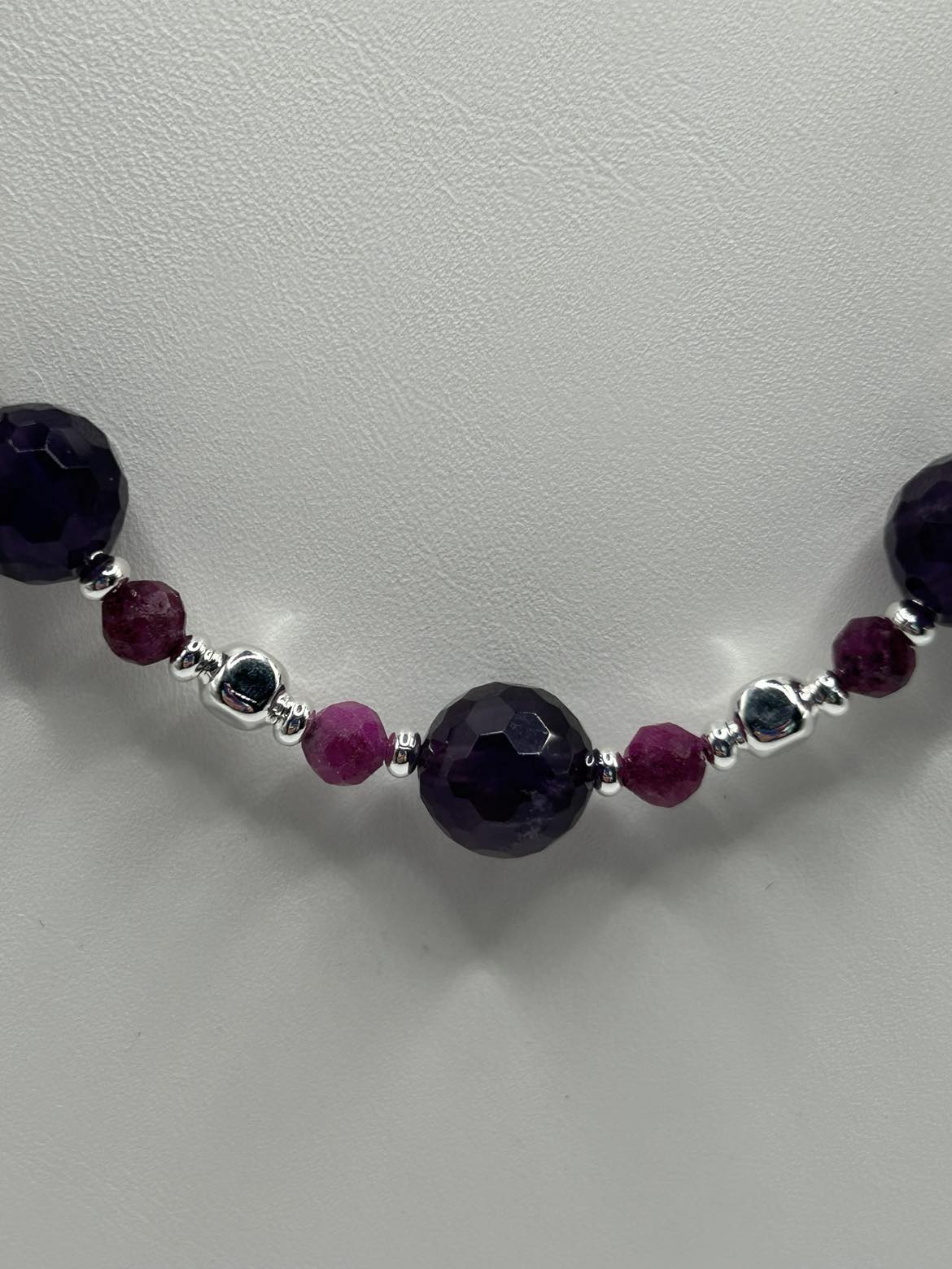 Regal purple Amethyst is joined by luscious red Ruby in this stunning piece!! Sterling silver ear wires support drop earrings. The necklace is 18 - 20 inches long with an oversize lobster claw clasp for ease of use.