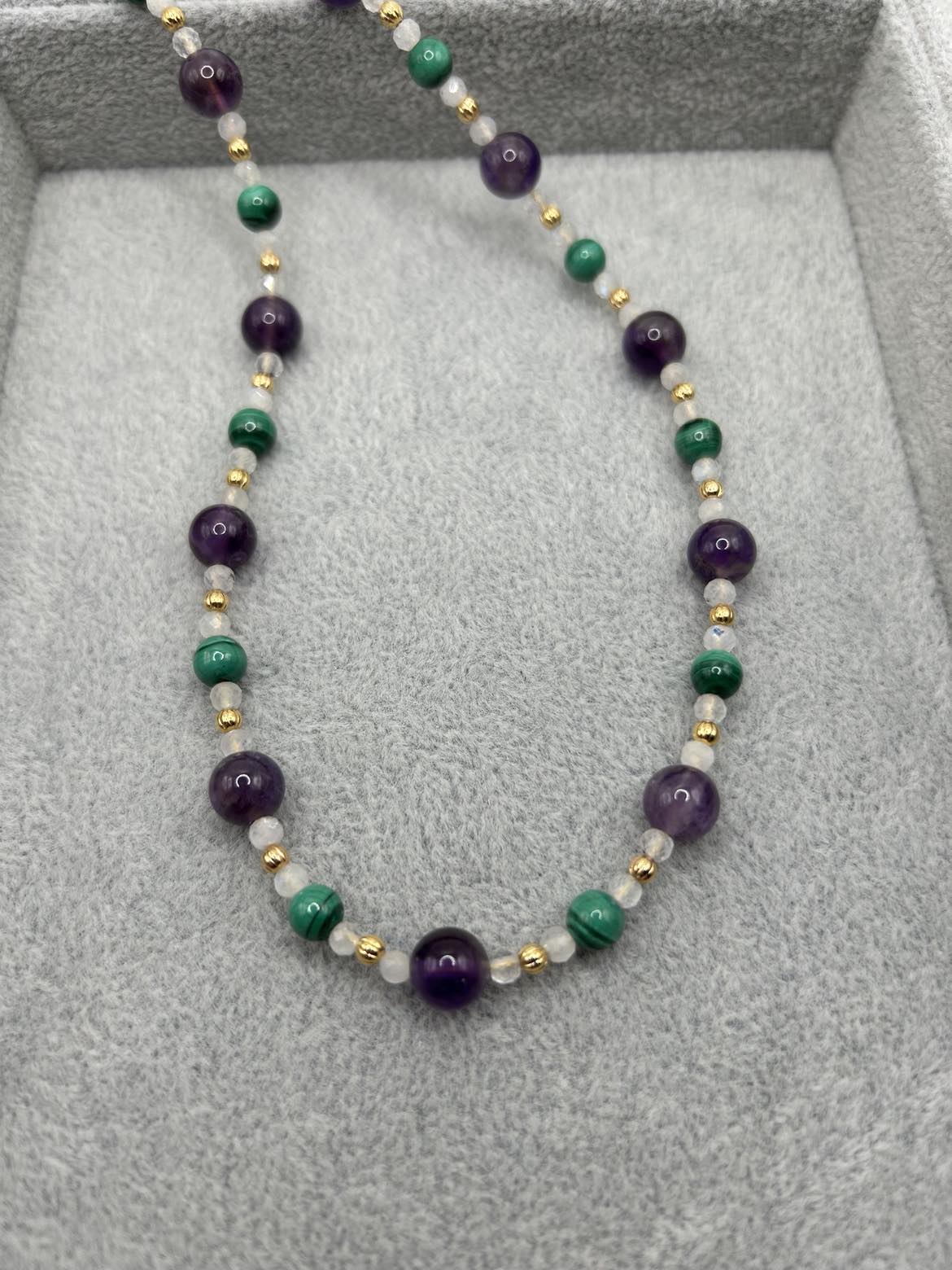Purple Amethyst rounds combine with green Malachite rounds and white Rainbow Moonstone faceted rounds for a fresh look! Gold-plated ear wires support hoop style earrings. The necklace is 21 - 23 inches long, with an oversize lobster claw clasp for ease of use.