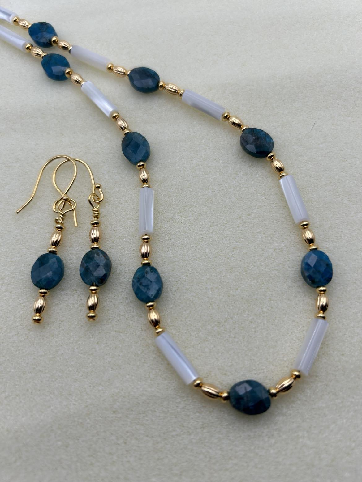 Beautiful blue Apatite is paired with white Mother of Pearl tubes for a unique look! Earrings are secured with gold-plated ear wires. 19.5 - 21.5 inches long. Oversized lobster claw clasp for ease of use.