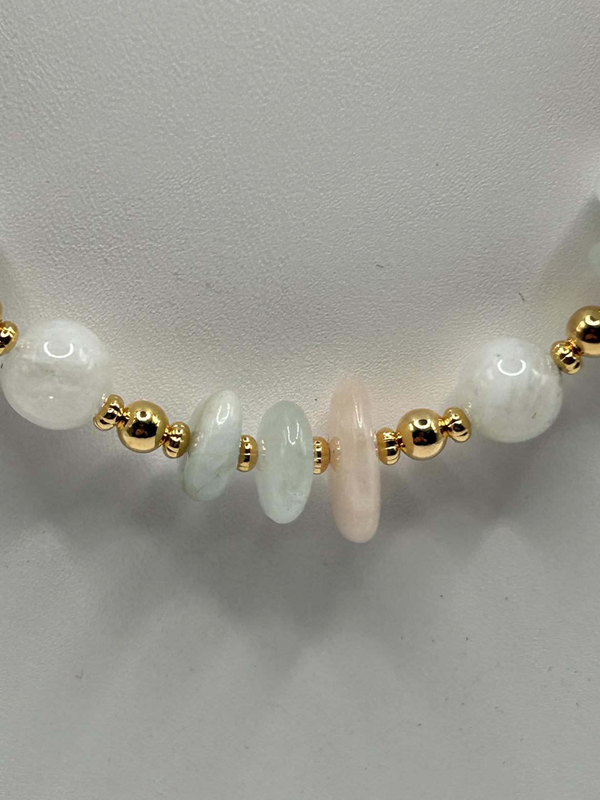 The pale pinks and blues and greens of Beryl freeform disks blend with Moonstone rounds in this charming piece. Gold-plated ear wires support hoop style earrings. The necklace is 23 - 25 inches long with an oversize lobster claw clasp for ease of use.
