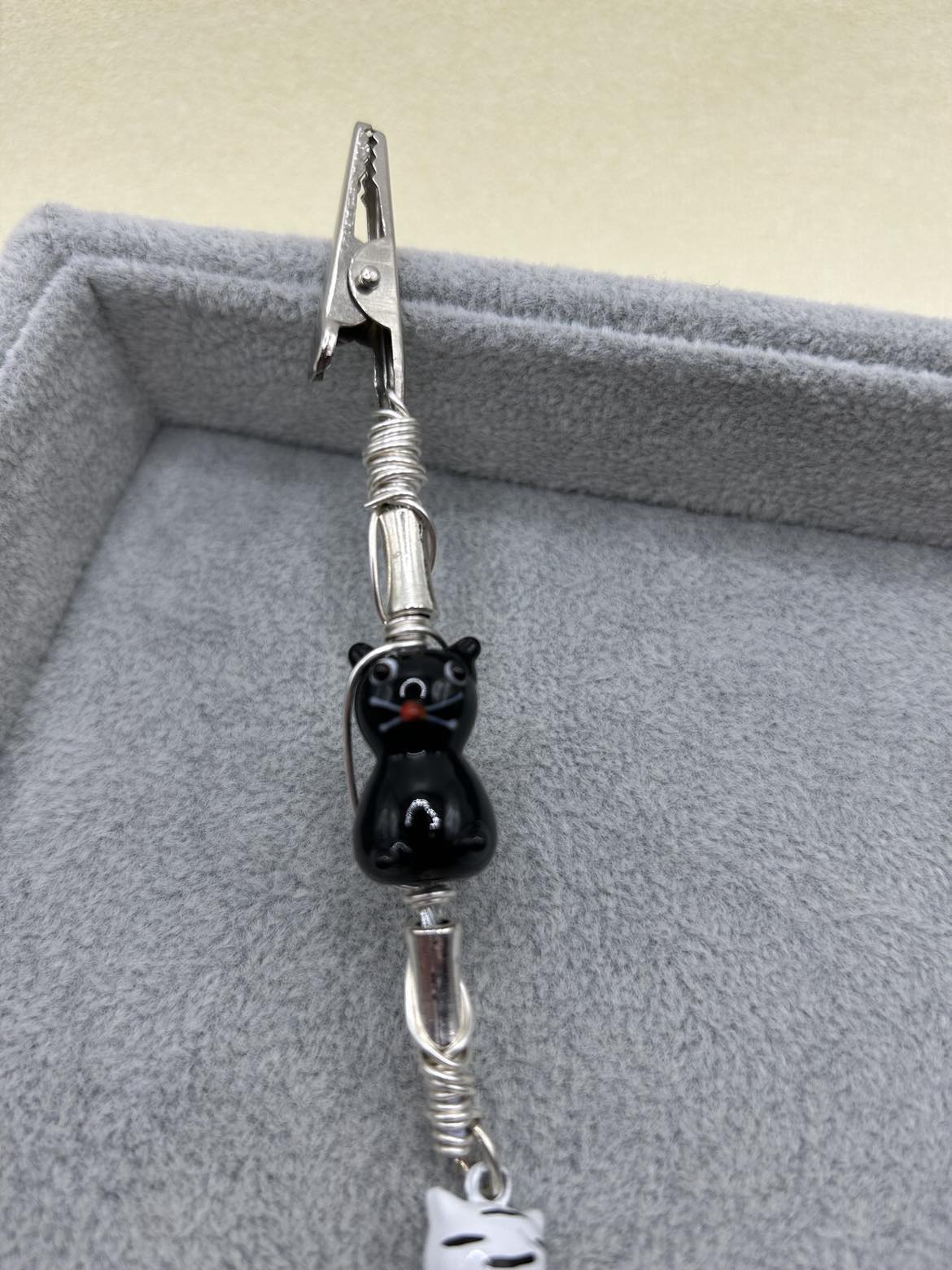 This clip sports two cats - a glass Black Cat bead and a white Cat Bell!!! This whimsical clip can be used to help put on a bracelet or to pull that card out of the machine or just about anything else you can imagine!!! The cats are securely wire wrapped to the alligator clip so there's no risk of them running away!!!