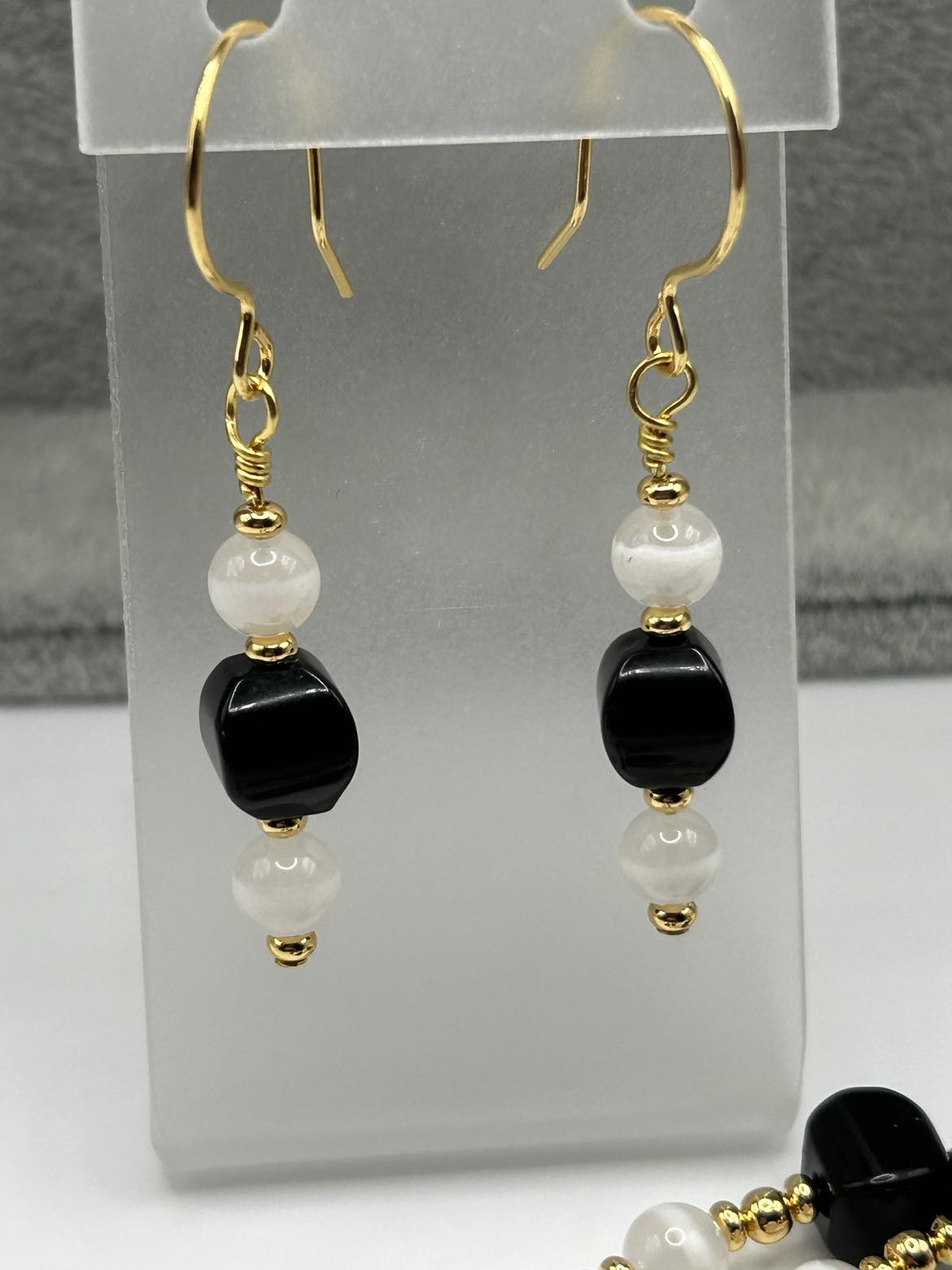 Black Obsidian rounded square beads are perfectly accented with round DZI Agate beads for an instant classic! Gold-plated ear wires support drop earrings. The necklace is 22 - 24 inches in length, with an oversize lobster claw clasp for ease of use. DZI Agate comes from central Asia; the process of marking the agate remains unknown.