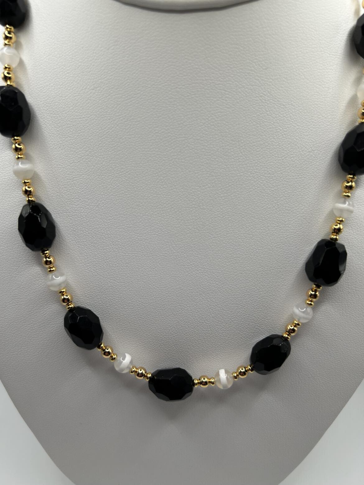It's a classic! Large faceted Black Onyx beads set off by white DZI Agate beads yield a stunning look! Gold-plated ear wires support drop earrings. The necklace is 18 - 20 inches long, with an oversize lobster claw clasp for ease of use. DZI Agate comes from central Asia; the process of marking the agate remains unknown.