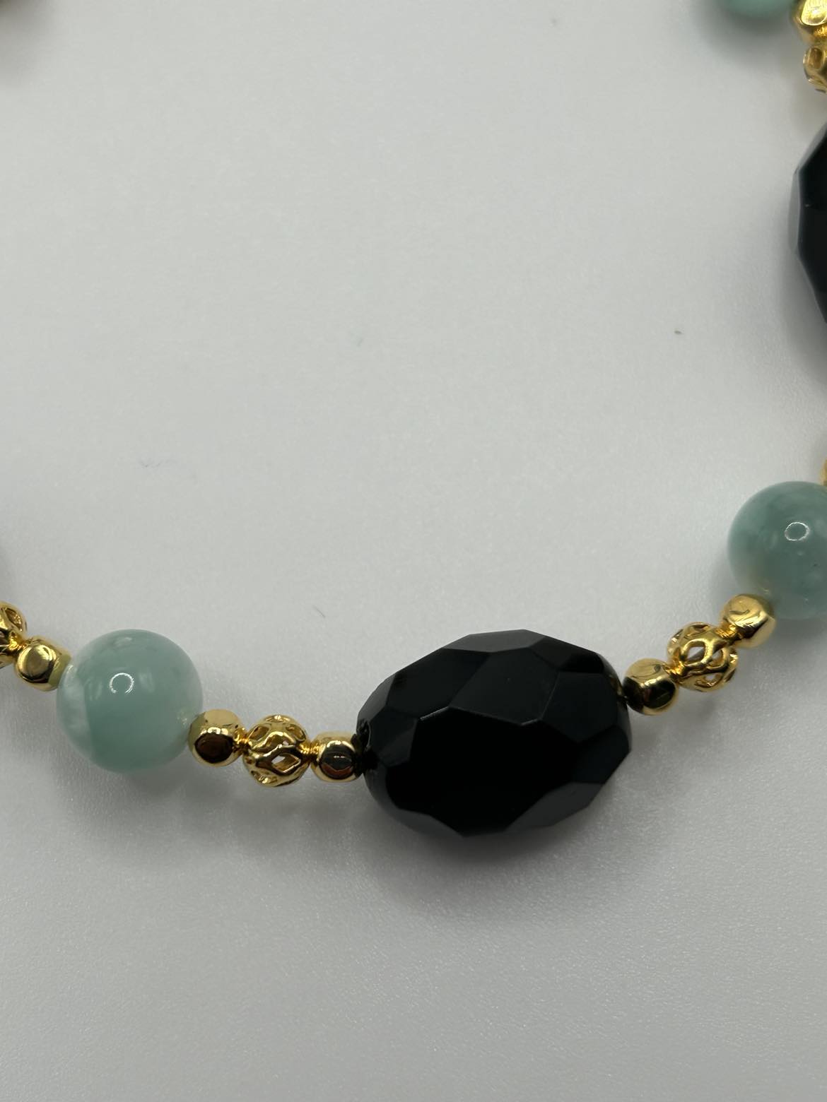Black Onyx beads contrast perfectly with green Pectolite in this handsome piece! Gold-plated ear wires support hoop style earrings. The necklace is 22 - 24 inches long, with an oversize lobster claw clasp for ease of use.