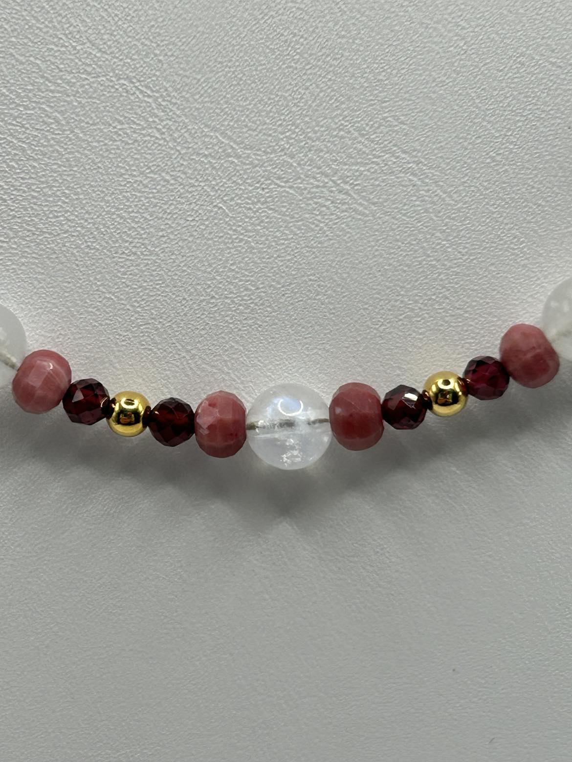 Blue Moonstone (white), Wood Rhodonite (pink) and Garnet (red) combine for a fresh look!! Gold-plated lever backs support hoop style earrings. The necklace is 18 - 20 inches long, with an oversize lobster claw clasp for ease of use.