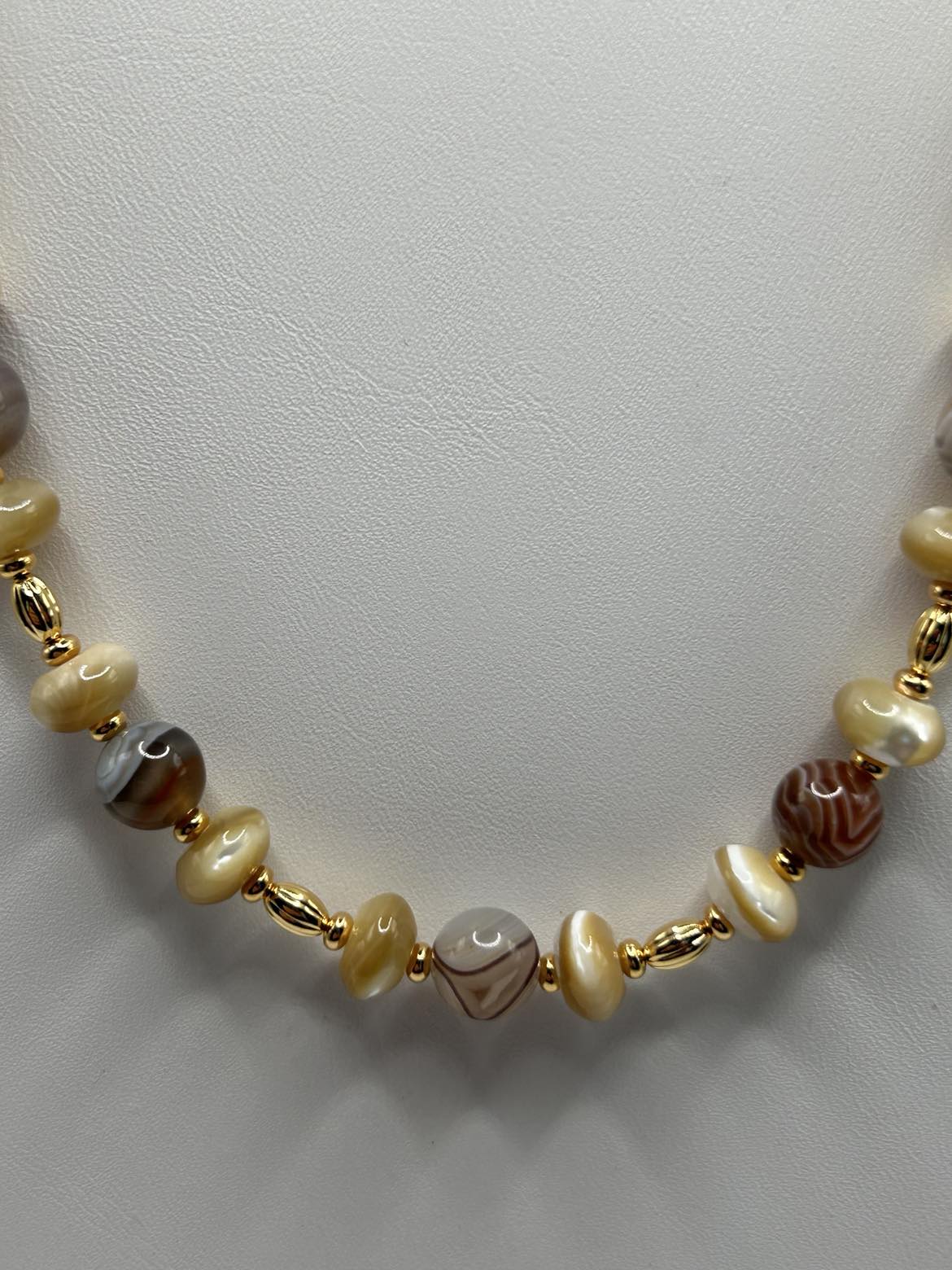 The browns and tans and greys of Botswana Agate pair perfectly with Brown Mother of Pearl in this unusual piece! Gold-plated lever backs support hoop style earrings. The necklace is 20 - 22 inches long, and sports an oversize lobster claw clasp for ease of use.