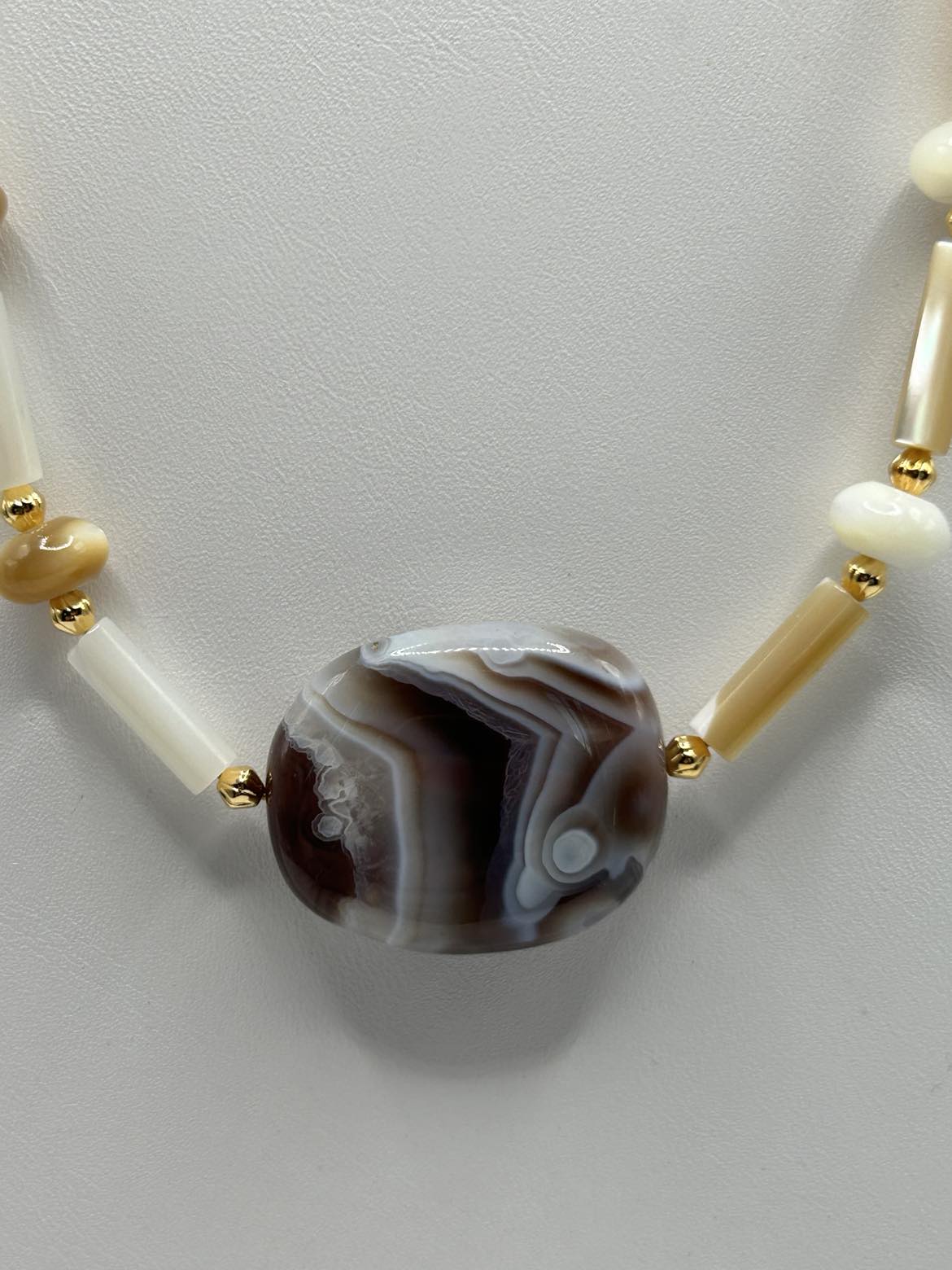 A large Botswana Agate focal bead is paired with colors of Mother of Pearl in this striking piece! Gold-plated lever backs support hoop style earrings. The necklace is 20 - 22 inches long, and sports an oversize lobster claw clasp for ease of use.