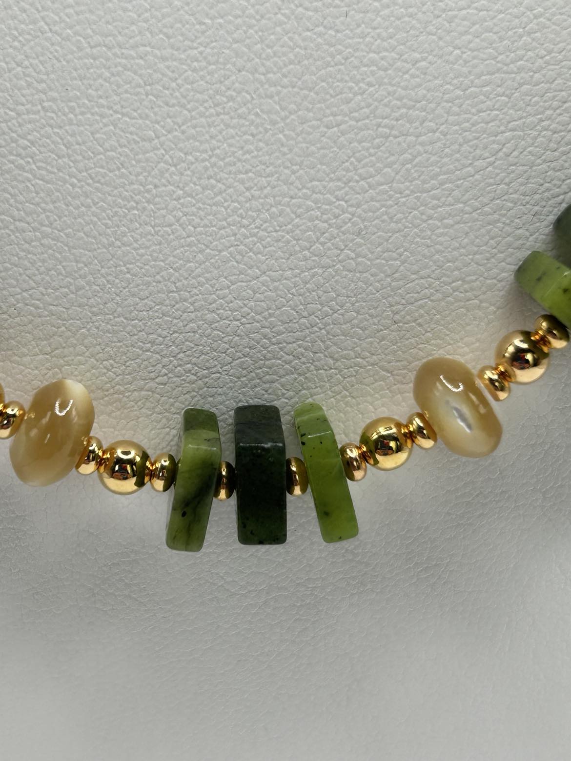 Green Canadian Jade squares combine with Brown Mother of Pearl for a fresh, new look! Gold-plated lever backs support hoop style earrings. The necklace is 21 - 23 inches long, and has an oversize lobster claw clasp for ease of use.