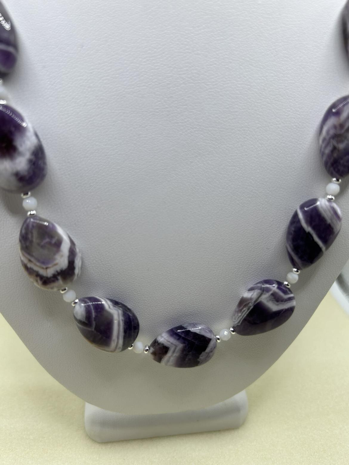 For the Amethyst lovers we have Chevron Amethyst teardrops with Dogtooth Amethyst rounds combined with white Mother of Pearl to create a statement piece! Sterling silver ear wires support earrings that can be used alone or with the necklace. 21 - 23 inches long. Oversized lobster claw clasp for ease of use.