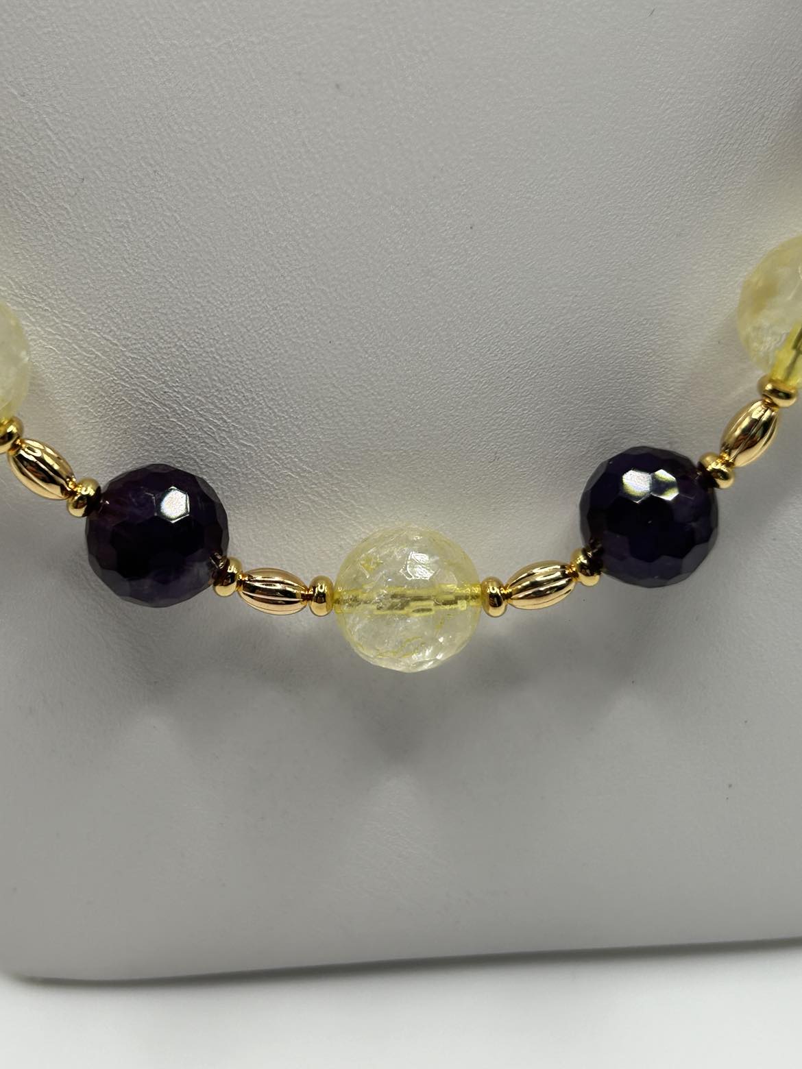 Pale yellow Citrine is paired with deep purple Amethyst in this classic piece. Gold-plated ear wires support drop earrings. The necklace is 22 - 24 inches long, with an oversize lobster claw clasp for ease of use.