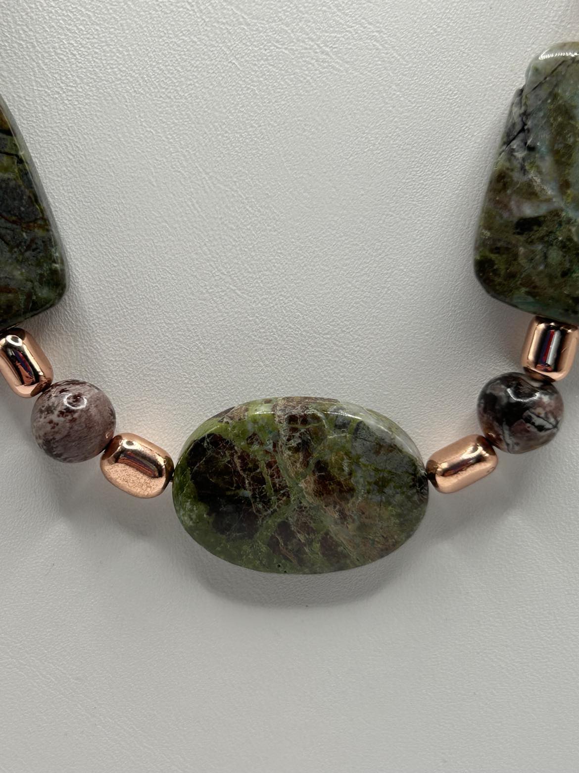 Calling all earth-tone lovers!! Have I got a piece for you!! Wonderful greens and browns of Copper Ore Jasper mix with the browns and greys of Sonora Jasper in this stunning piece!! Copper-plated lever backs support drop earrings. The necklace is 19 - 21 inches long, with an oversize lobster claw clasp for ease of use.
