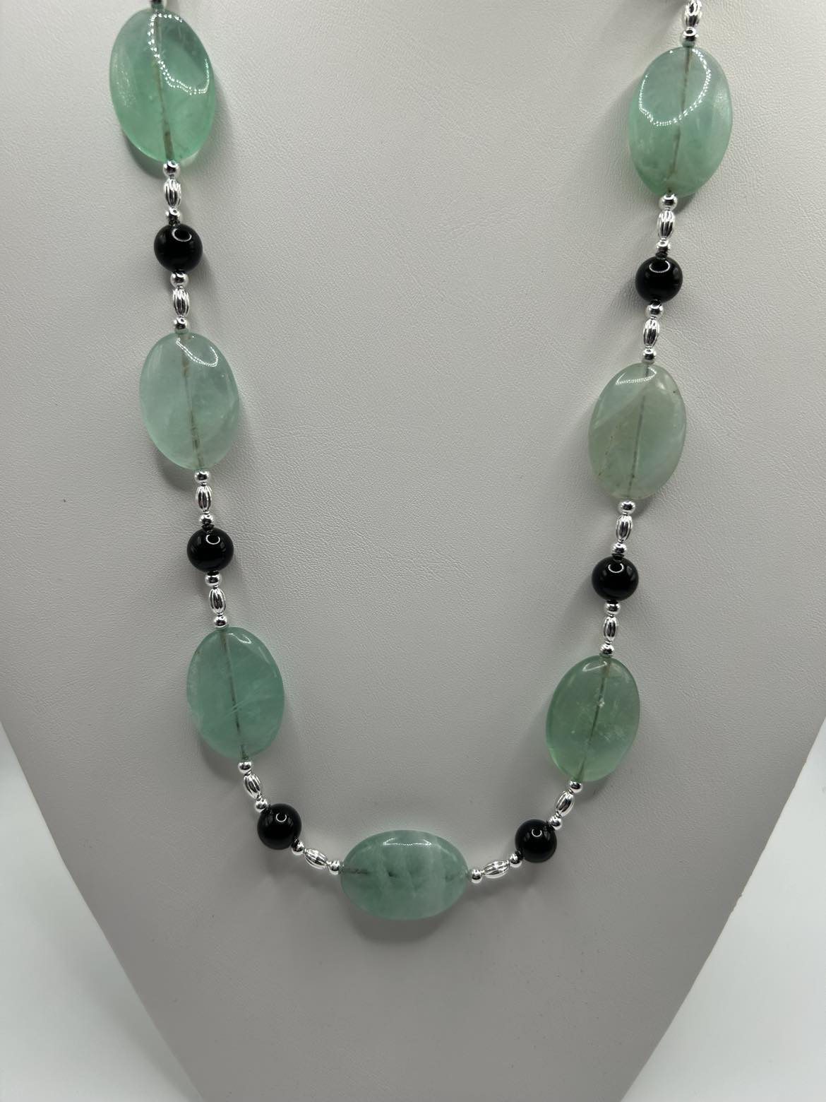 This piece features Fluorite oval focal beads, Rainbow Fluorite in the earrings, and Black Onyx to act as grounding. Sterling silver ear wires support hoop style earrings. The necklace is 20 - 22 inches long, with an oversize lobster claw clasp for ease of use. Because the main stones are large, this piece is a bit heavy.