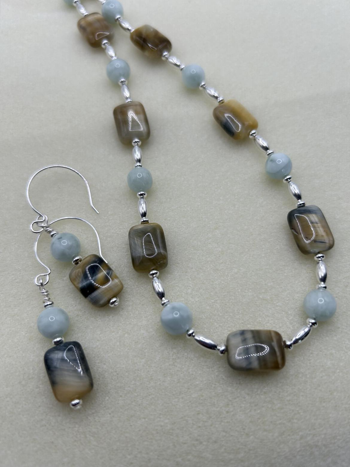 Golden Tiger Eye rectangles and Green Pectolite rounds combine to make a stunning statement! Earrings with sterling silver wires highlight the piece. 21 - 23 inches long. Oversized lobster claw clasp for ease of use.
