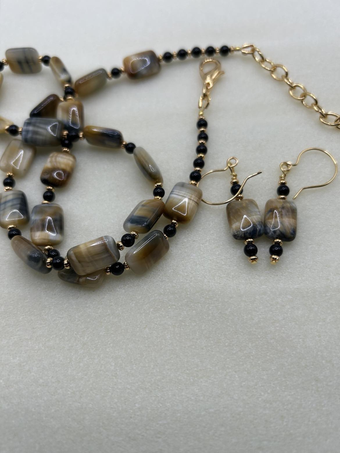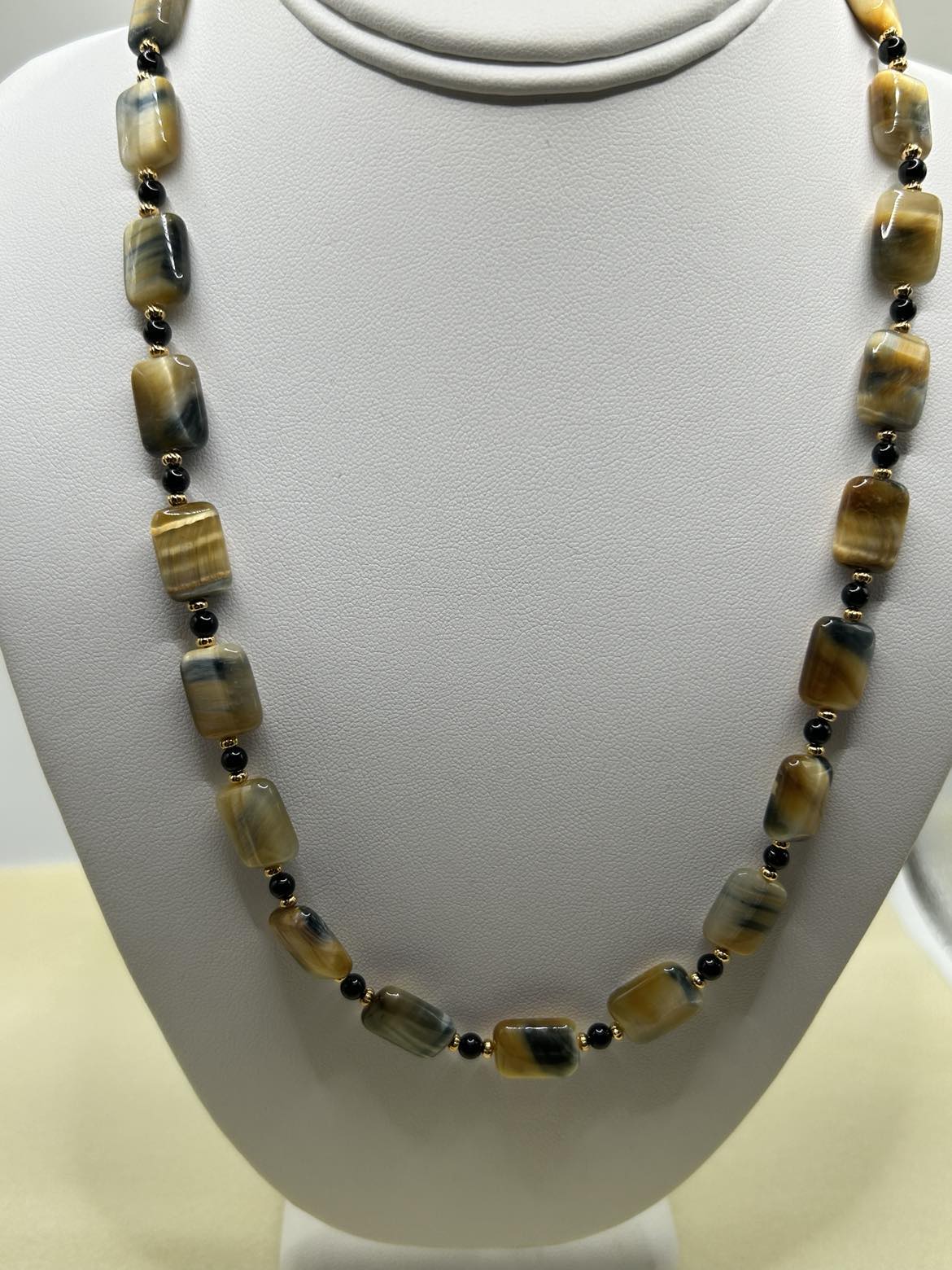 Golden Tiger Eye rectangles combined with Black Onyx beads and gold-tone accents. Gold plated ear wires. 21 - 23 inches long. Oversized lobster claw clasp for ease of use.