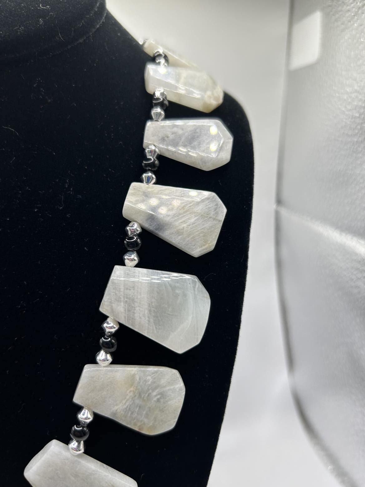 A one-of-a-kind look with Grey Moonstone and Natural Onyx (black). Sterling silver lever backs support hoop style earrings. The necklace is 22 inches long, and has an oversize lobster claw clasp for ease of use.