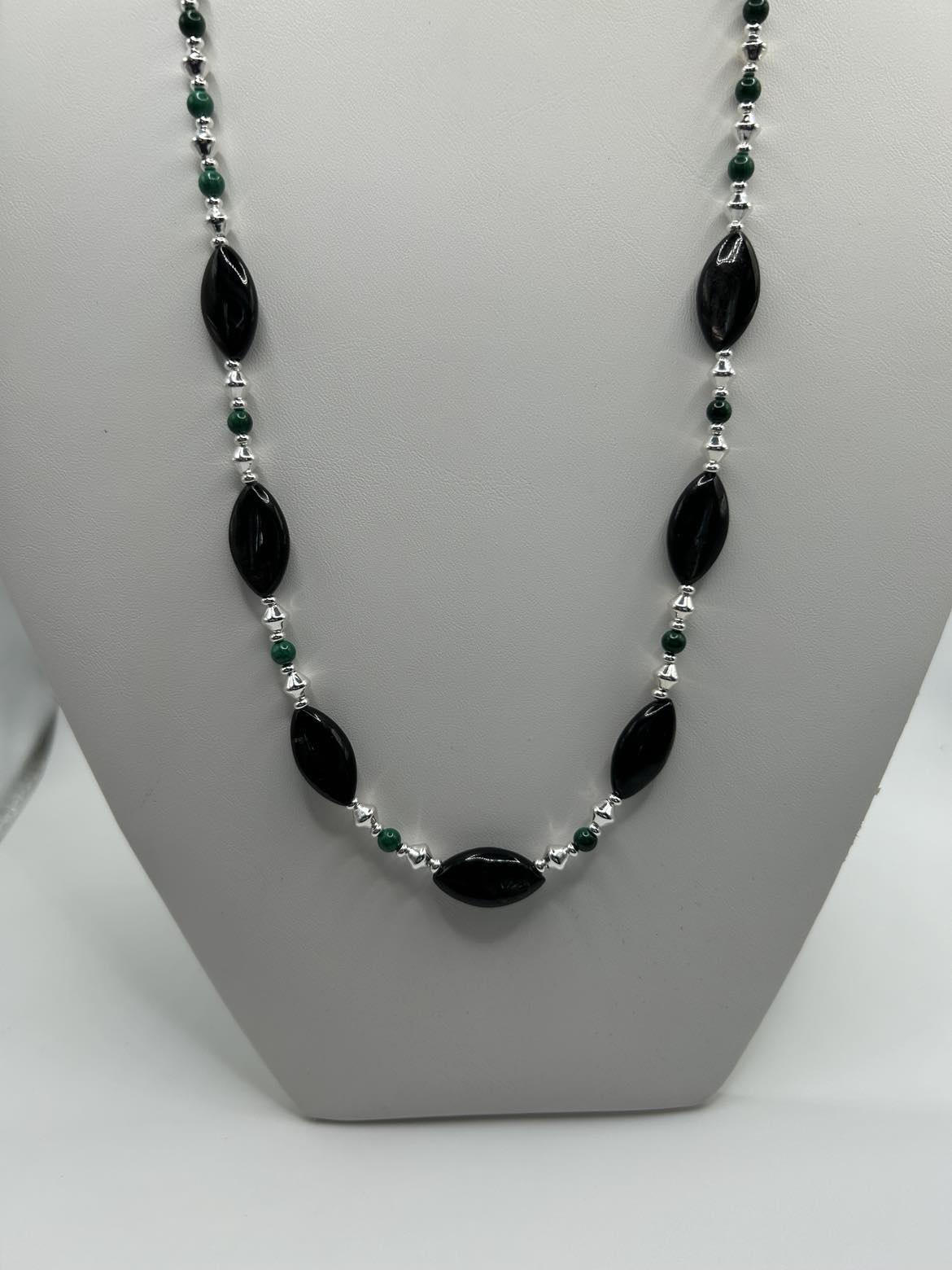 Hypersthene has an inner glow, called chatoyancy, that is basically impossible to photograph!! Here it is paired with green Malachite for an impressive look! Sterling silver lever backs support hoop style earrings. The necklace is 2i0.5 - 22.5 inches long, with an oversize lobster claw clasp for ease of use.