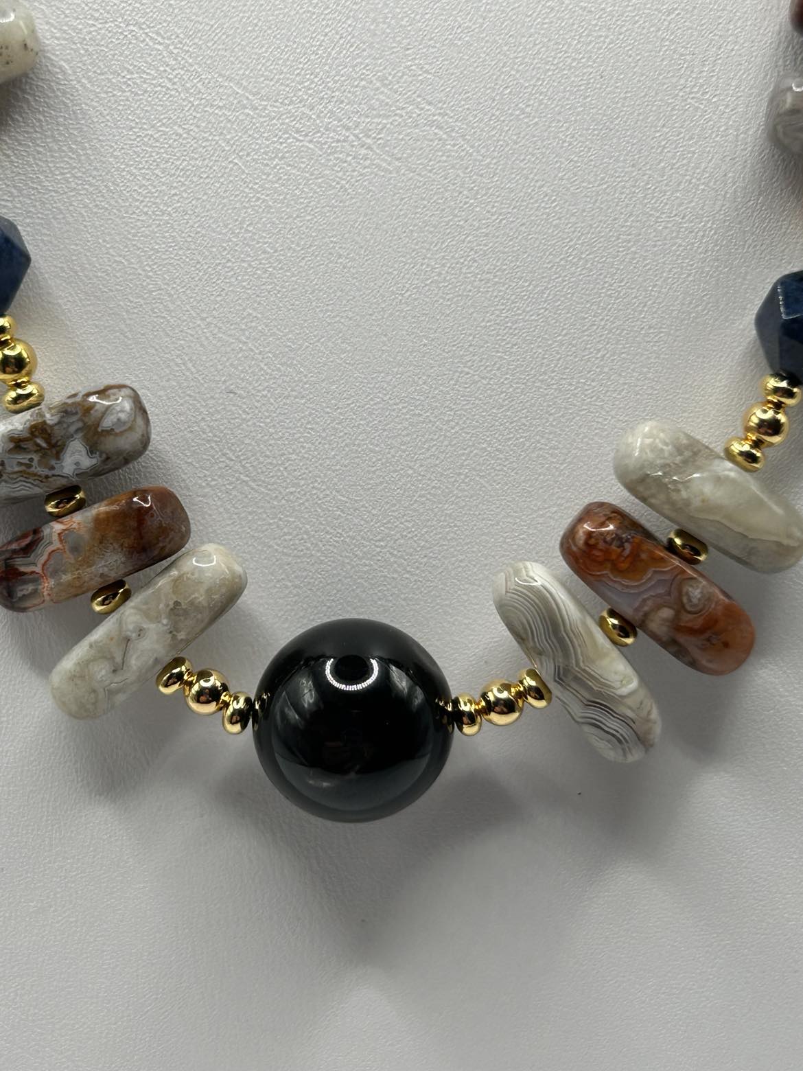 This piece was sort of a challenge from members of my beading group!! The Hypersthene focal is surrounded by Mexican Laguna Agate long beads and blue Sunset Dumortierite beads in this unique piece! Gold-plated ear wires support drop earrings. The necklace is 18 - 20 inches in length, and has an oversize lobster claw clasp for ease of use.