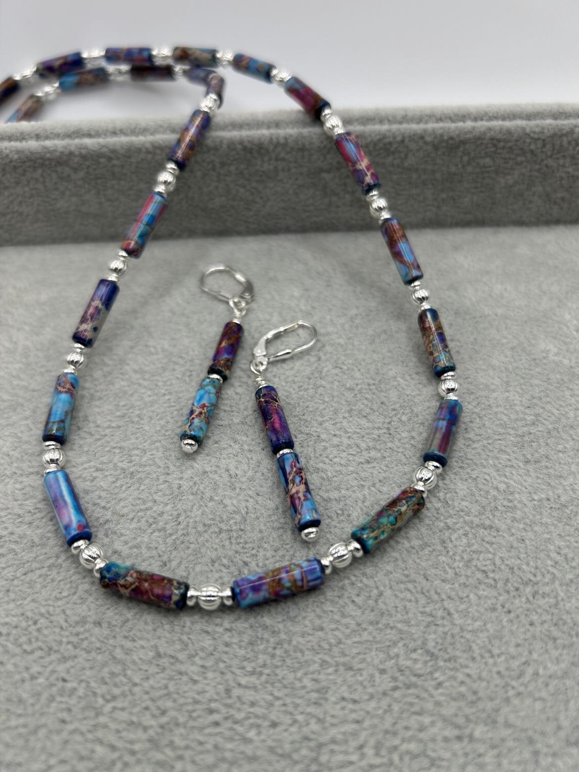 Impression Jasper (dyed) combined with silver spacers create a stunning look!!! Sterling silver lever backs add interest. The necklace is 28 - 29 1/2 inches long, with a oversized lobster claw clasp for ease of use! Long enough to go on over the head if you choose.