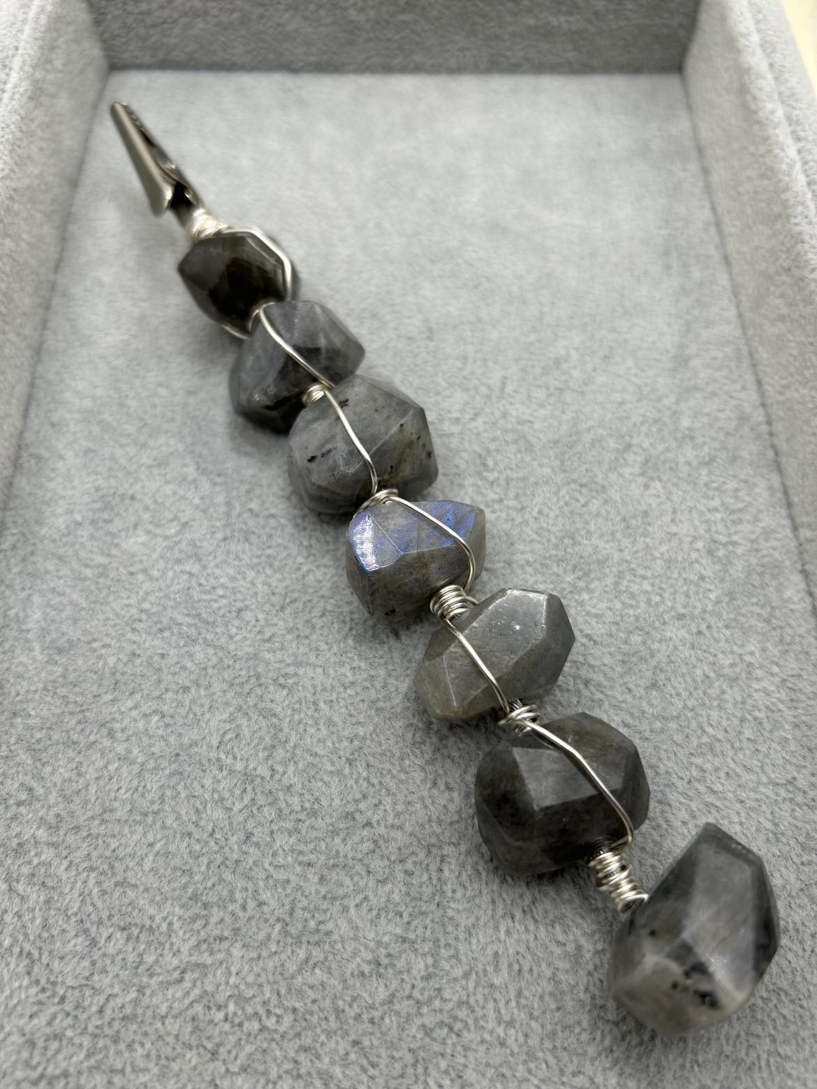 Mysterious Labradorite is featured in this clip. You can see the blue flash on the middle stone if you look closely! Labradorite is said to enhance creativity and consciousness - who wouldn't want that???? The gemstones are securely wire wrapped to provide a sure grip, whether you're using it to help put on a bracelet or tug that card out of the machine!