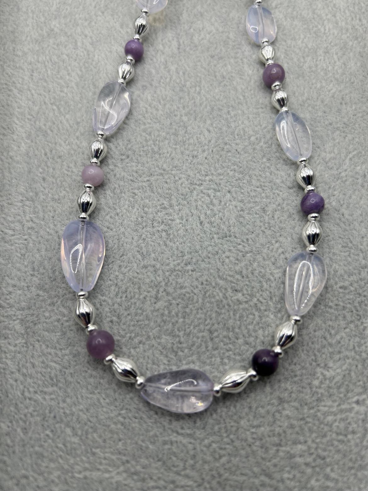 Pale, translucent Milky Lavender Amethyst is paired with the many hues of purple in Sugilite for an enchanting look!! Sterling silver ear wires support hoop style earrings. The necklace is 22 - 24 inches long, with an oversize lobster claw clasp for ease of use.