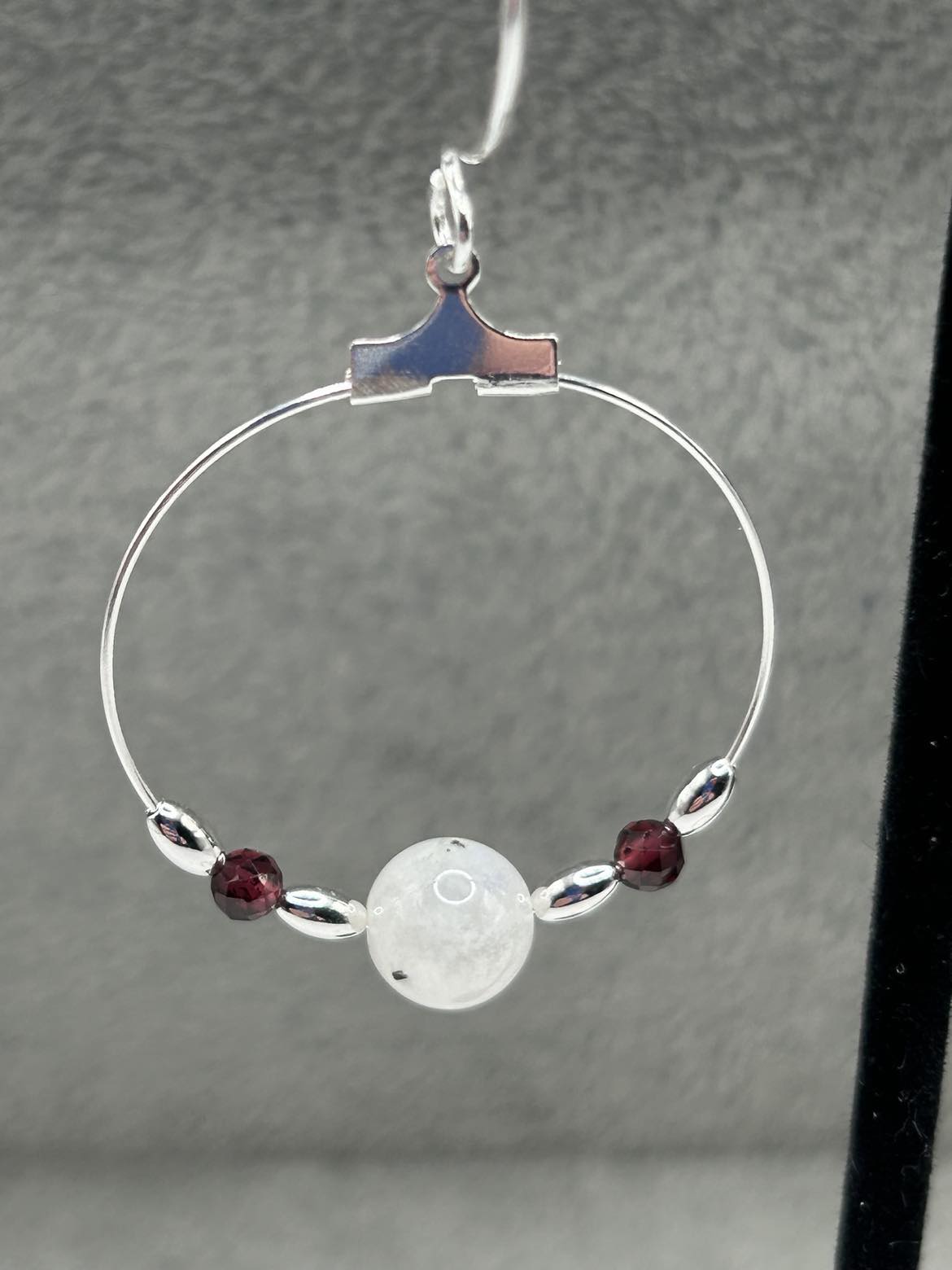 Three different sizes of Moonstone combine with tiny red Garnet to create this classic necklace! Sterling silver ear wires support hoops tyle earrings. The necklace is 20 - 22 inches long, with an oversize lobster claw clasp for ease of use.