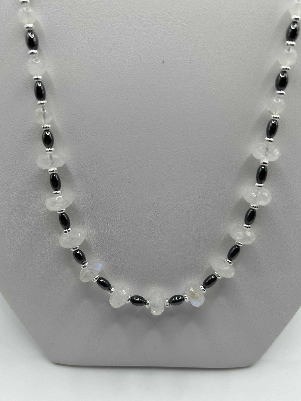 Vibrant Moonstone is paired here with dark grey Hematite for a classic look!! Sterling silver lever backs support hoop style earrings. The necklace is 22 - 24 inches long, with an oversize lobster claw clasp for ease of use, although this one is long enough to just slip on over your head if you choose!