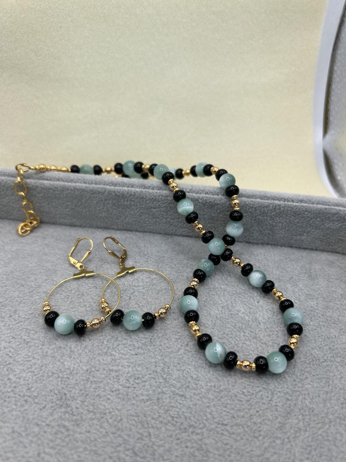 Subtle shades of green-blue in Pectolite beads are paired with the black Natural Onyx disks to create a classic piece. Gold-plated lever backs support hoop earrings. 19.5 - 21.5 inches long. Oversized lobster claw clasp for ease of use.