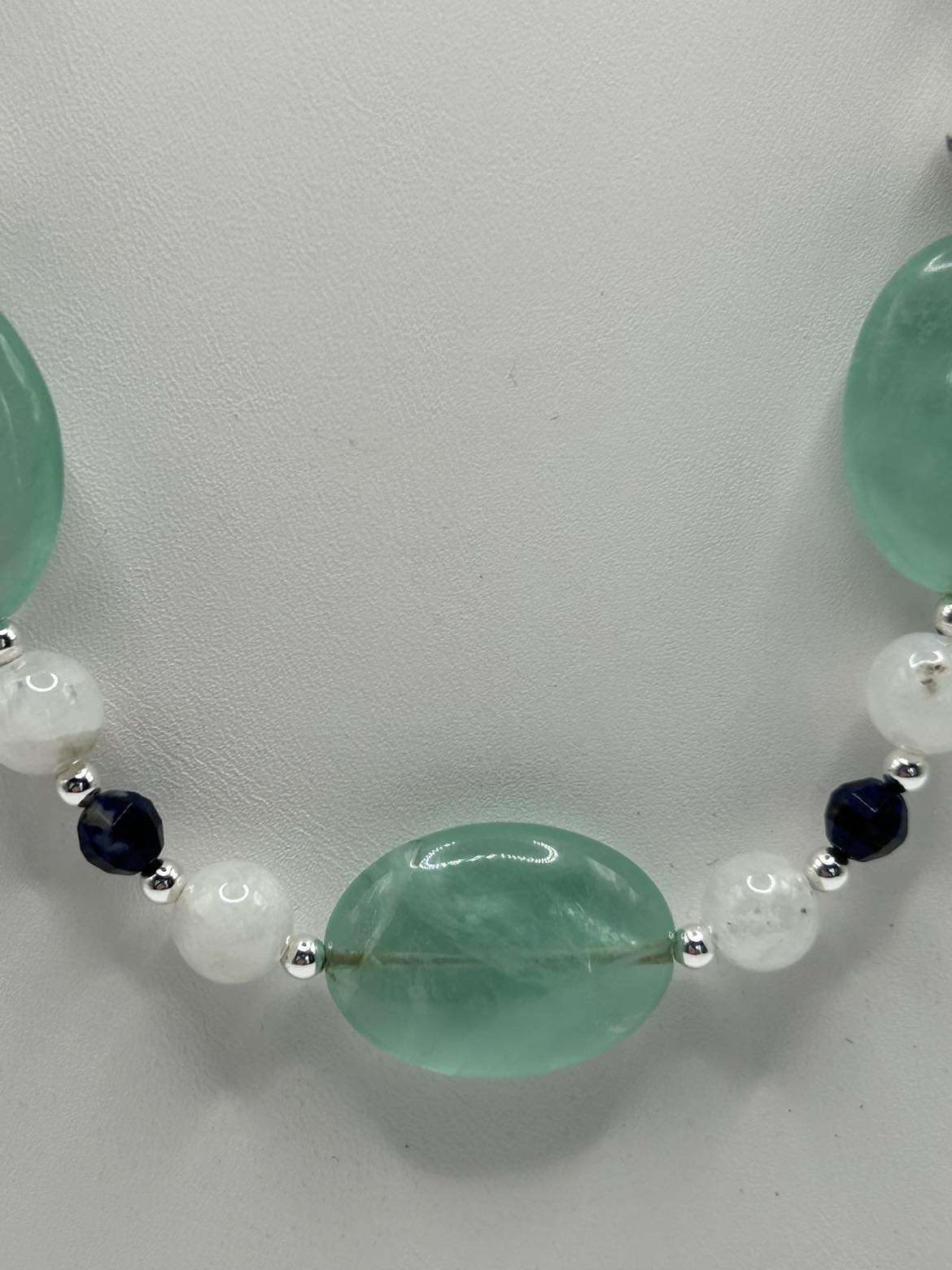 Bright translucent green Rainbow Fluorite combines with white Moonstone and dark blue Sodalite in this unusual piece! Sterling silver ear wires support hoop style earrings. The necklace is 22 - 24 inches long, with an oversize lobster claw clasp for ease of use.