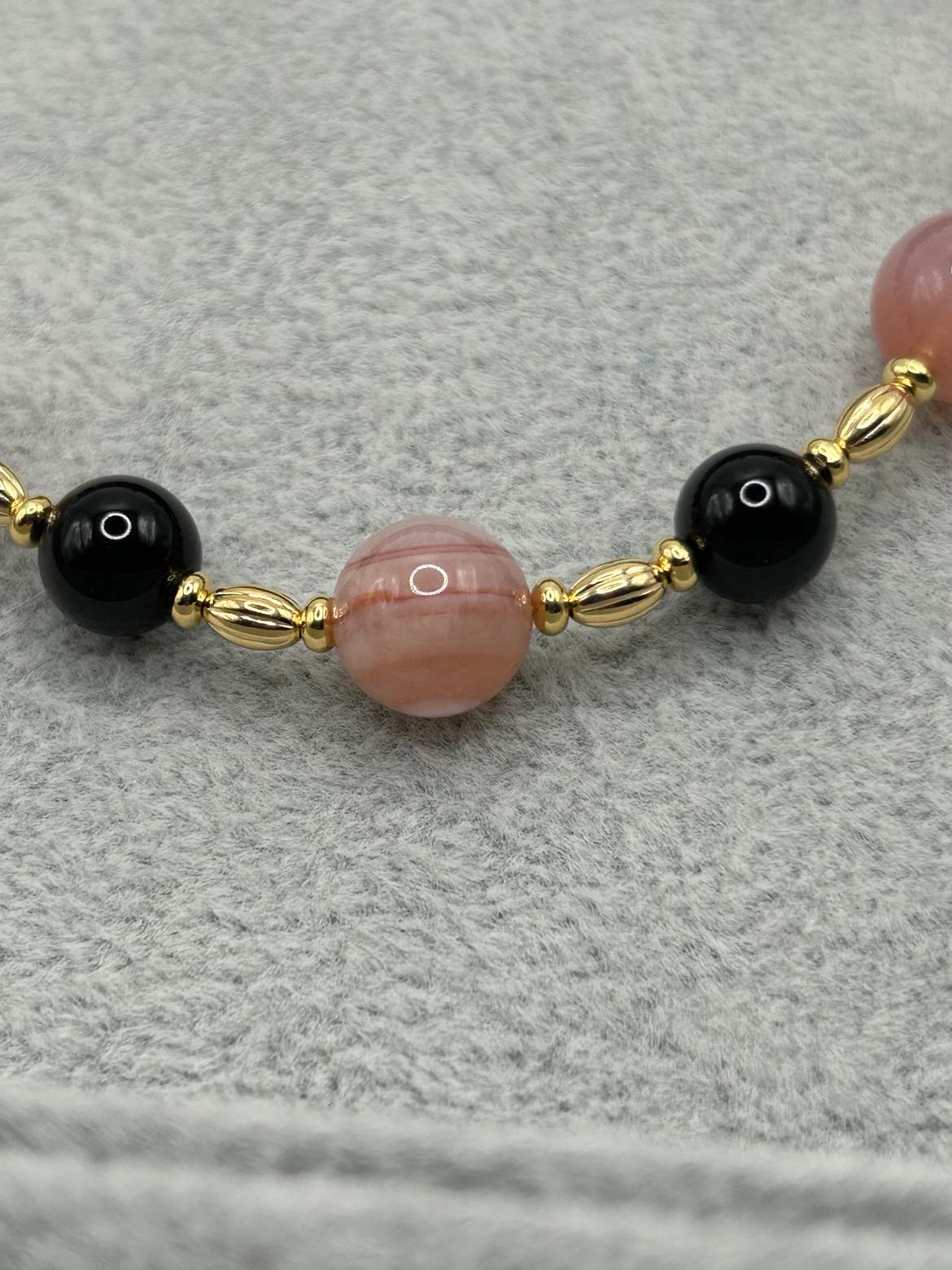 The swirls and colors of Red Botswana Agate are accented by Black Onyx in this stunning piece. Gold-plated lever backs support hoop style earrings. The necklace is 23 - 25 inches long, with an oversize lobster claw clasp for ease of use.