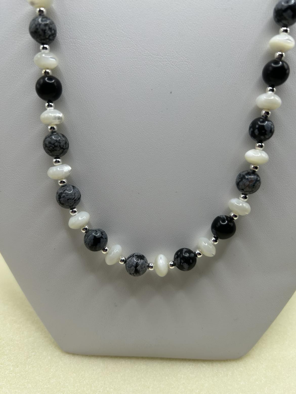 Here we have Grade A Snowflake Obsidian blended with white Mother of Pearl for that classic look!! Sterling silver ear wires support drop earrings. The necklace is 26 - 28 inches long, and has an oversize lobster claw clasp for ease of use.