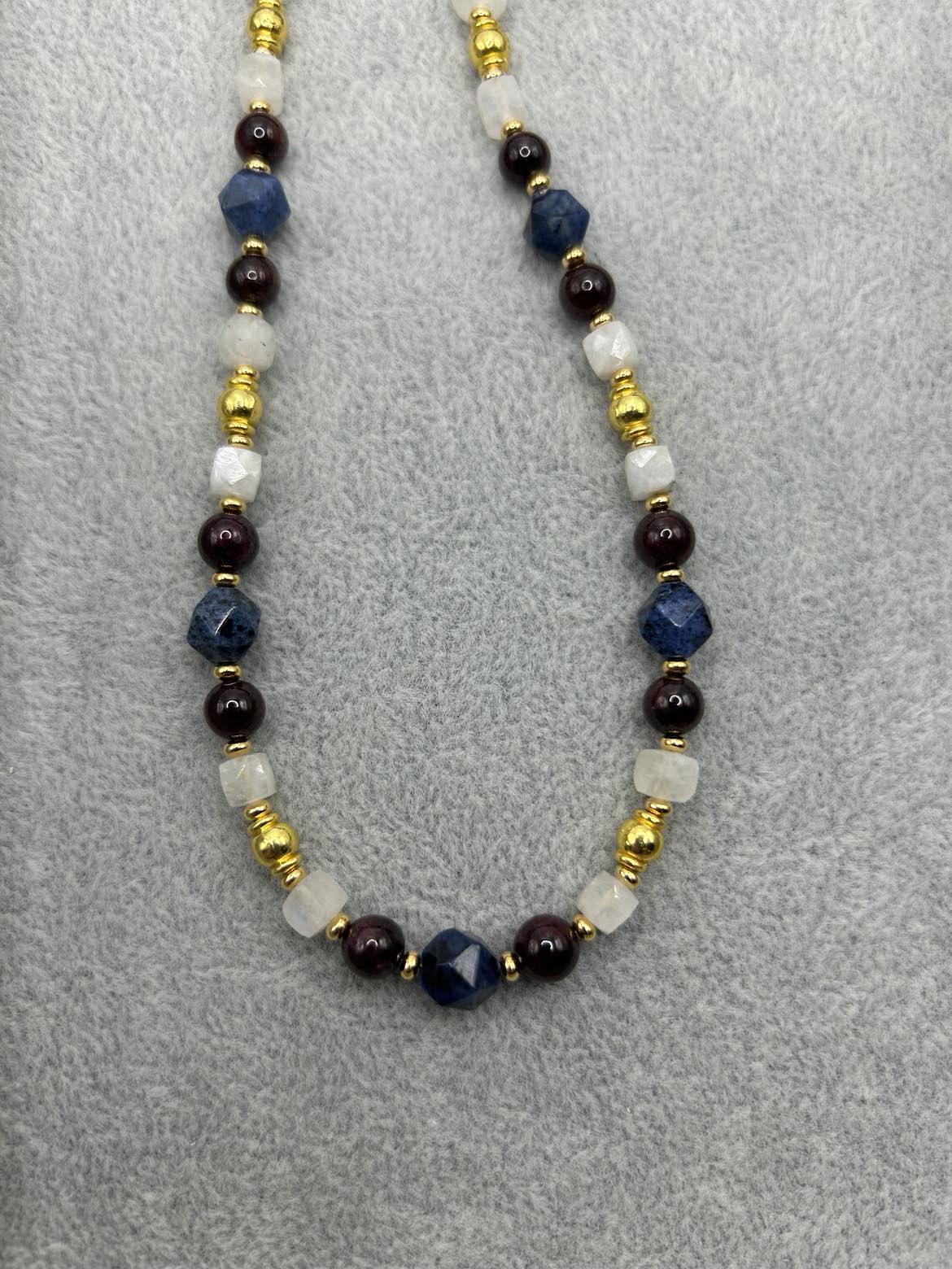 Blue Sunset Dumortierite is paired with dark red Garnet and white Moonstone cubes in this classic piece. Gold-plated ear wires support hoop style earrings. The necklace is 22 - 24 inches long, with an oversize lobster claw clasp for ease of use. I was so focused on the shapes of the gemstone beads and the spacers that I was halfway through the necklace before I realized the colors were red, white and blue. Go Bills!!!!