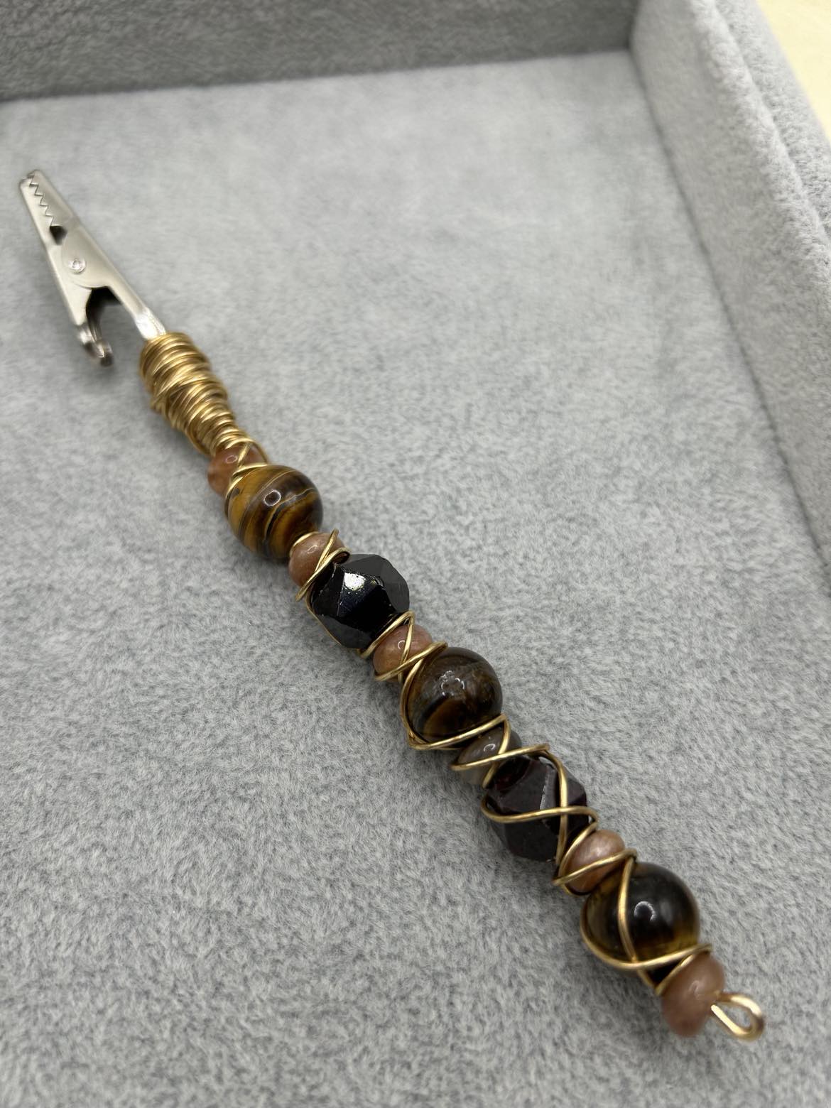 This clip is all gemstones, all the time!!! From the round Tiger Eye to the faceted chunks of Garnet, to the flat round Sunstone, all you see is gems!!! This clip can be helpful for putting on a bracelet to pulling a card out of the machine to whatever you can dream up!!! It's well made to give you years of faithful service!!!